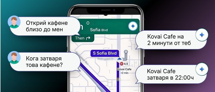 Можеш да поискаш от АI асистента да намери места близо до теб или близо до дестинацията, и то по конкретни критерии. Например „Открий кафене близо до мястото Х, в което се предлага тирамису“.